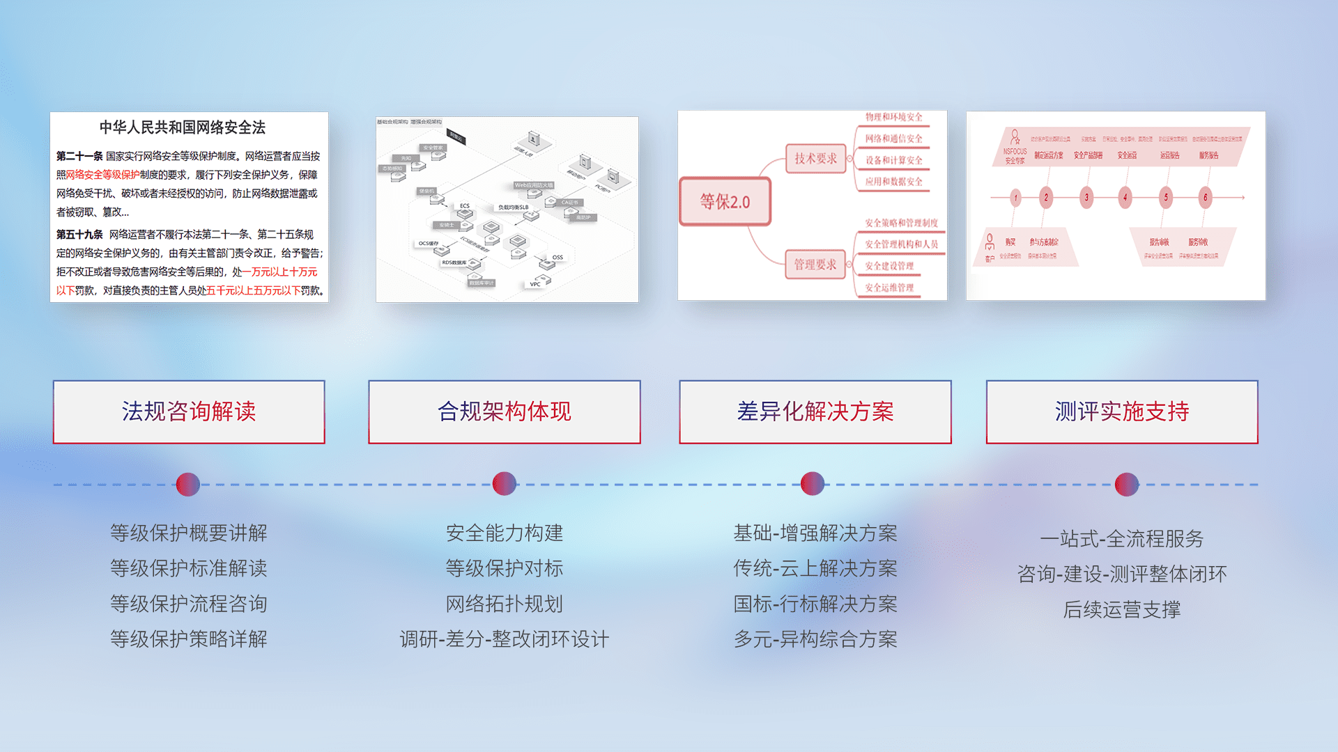 通过专业的法律咨询解读、、、、合规架构体现、、、差异化解决方案、、测试实施支持等服务,,为客户量身打造等保合规体系。。。。